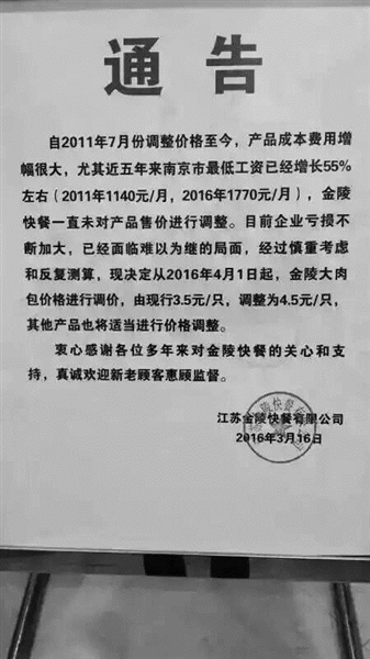 也许是为了让市民能更清楚地了解,告知中还特地将相关的最低工资变动情况列出:2011年1140元/月,2016年1770元/月。不仅如此,从4月1日起和金陵大肉包一起调价的还有其他产品。