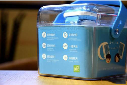 盒子侧面提供了产品功能介绍“双向对话、实时定位、超长待机、一键求助、安全保护和语音聊天”六大主要功能。