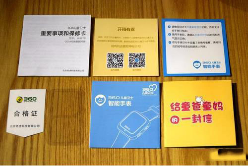 较为意外的是在纸质物品的配置上,可以称之为玲琅满目“保修卡、惊喜卡、简易使用手册、合格证、额外赠送的2块屏幕贴膜、产品说明书和给童爸童妈的一封信”;或许在此不应该有什么挑骨头之处,不过笔者还觉得有些繁琐,还不如额外赠送1对表带来得实际。
