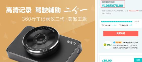 全新纪录!360行车记录仪二代众筹上线首日金额破百万
