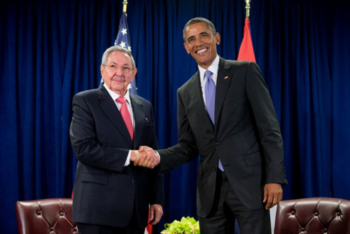 2015年9月29日,奥巴马和劳尔•卡斯特罗在联大会议间歇举行了双边会晤。这是劳尔和奥巴马自今年4月在巴拿马首次历史性地碰面后第二次面对面交谈,同时也是7月美国与古巴恢复外交关系以来两人第一次举行会谈。