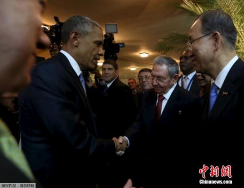 当天下午,在以美洲国家首脑会议标识为背景板的一个房间里,奥巴马与卡斯特罗坐下来会晤并握手。分析称,虽然会晤条件相对简陋,但双方的座位安排与白宫椭圆形办公室平时接待外国领导人的规格“完全一致”。