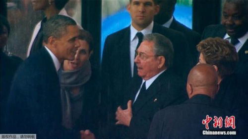 2013年12月10日,美国总统奥巴马在南非出席该国前总统曼德拉的追悼大会期间发表讲话,并与同样出席活动的古巴领导人劳尔卡斯特罗短暂握手,后者报以微笑。
