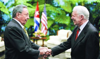 2011年3月29日,古巴领导人劳尔•卡斯特罗在哈瓦那会见了美国前总统吉米•卡特,卡特同时也是诺贝尔和平奖得主,离任后仍活跃于世界舞台。两人亲切握手寒暄。