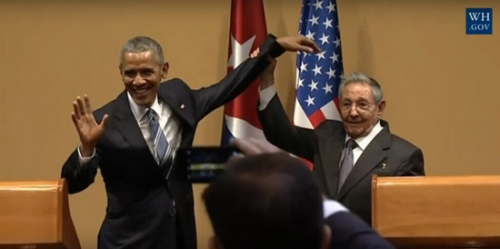 奥巴马在古巴革命宫与劳尔•卡斯特罗会晤,二人面对镜头微笑握手,会后共见记者。奥巴马表示,半个多世纪以来,美国总统访问古巴的场景简直“无法想象”,但今天是“新的一天”,两国正在“向前努力”而非“向后看”,美国不把古巴视为对自身的威胁,美古关系开启新篇章。