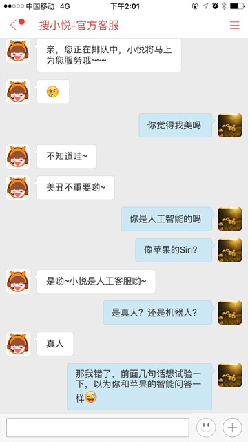 5.人工客服—搜小悦随时为用户解惑。这大概是搜悦APP最人性化的功能了。由于搜悦的功能实在是有点多,特地安排了人工客服搜小悦即时处理用户的各种疑问和需求。豹眺君试用了一下,绝不是苹果的Siri语音控制,它是货真价实的人工服务,信息处理速度极快。