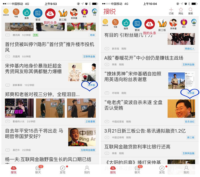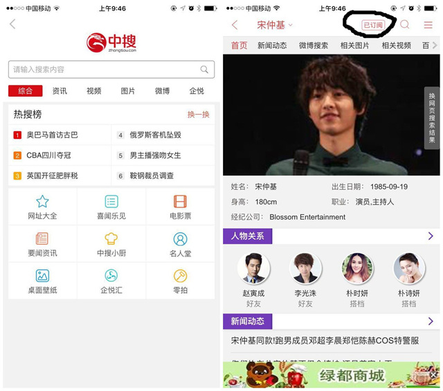 如果打开搜悦的“订阅大全”,其实与今日头条们“大同小异”:都有很多基础性栏目,如社会、财富、娱乐、漫画等等,这些属于“泛兴趣圈”。可是豹眺君如果仅仅对“娱乐圈”中的宋仲基感兴趣呢?搜悦的“细颗粒化”价值就在这时体现出来:点击首页的“搜索”图标,就马上进入了中搜移动端的搜索引擎页面,输入“宋仲基”后,页面立即出现了搜索结果,好吧,看到右上角的“订阅”了吗?赶紧订阅,以后“我的头条”中宋仲基欧巴就会“常驻”了!