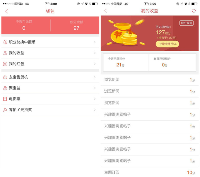 2.看资讯就能获得收益。就是这么简单,用户只需要每天通过搜悦APP来浏览新闻,订阅兴趣,发表评论,或者在兴趣圈 子里各抒己见,就能获取积分(积分会在“我的钱包”中显示)。而积分可以获得中搜币(10个积分兑换1个中搜币),只要攒够30币,就能在地铁里的友宝机买一杯可口可乐。当然,你也可以用中搜币购买电影票和悦商城中的任意商品。对于豹眺君这种连“五福”都不想集的“懒癌人群”来说,看看资讯就能攒积分买东西的形式无异于“白吃白喝”。