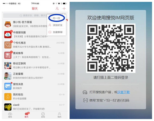 搜悦甚至还有自己的网页聊天版。与微信类似的是,打开APP中的“扫一扫”功能,对准网页版二维码,用户就能立刻登陆PC端聊天界面。