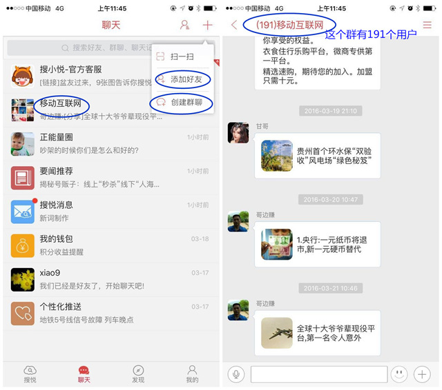 “举个例子,我在阅读资讯的同时,共同关注订阅了互联网金融圈,在这个圈子里我们可以发帖、跟帖讨论很多专业话题,也可以在搜悦上就拉一个群,甚至对某个经常发言的伙伴直接发起加为搜悦好友。可以一对一聊天,如果我们在聊天的过程中对彼此更加了解,甚至将进行一些商业合作。这是一个可以让你找到志趣相投朋友的地方”