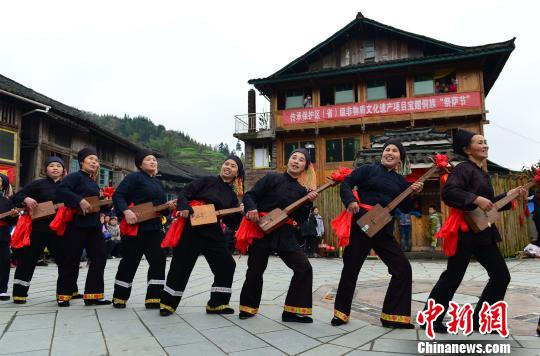 中新网桂林3月23日电(赵琳露 潘志祥)3月23日农历二月十五,广西桂林市龙胜各族自治县乐江乡宝赠村迎来一年一度的传统“祭萨节”,当地侗族民众唱起古老的侗族大歌,跳起传统的芦笙踩堂舞,摆上特色的侗家合拢宴,近万名中外游客在这里感受侗家人“祭萨”的古朴神秘和原生态的民族文化。