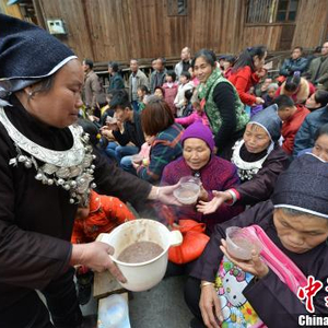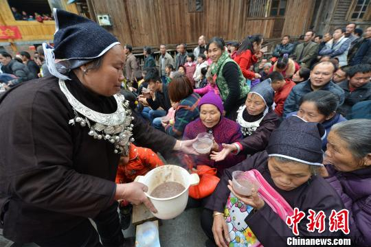 图为当地侗族民众在分发平安粥。 潘志祥 摄