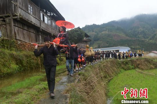当天上午,当地侗族民众抬着“萨岁”神像绕着寨子一周,紧随其后的巡游队伍挑着谷物,手捧糯米饭走过田垌间,挨家挨户送福。