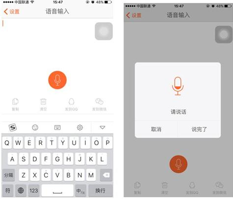 在最新的搜狗输入法iPhone版本中,用户可以轻松使用语音输入功能,能够准确识别用户语音,迅速转换成文字。用户安装搜狗输入法后,在设置选项中选择“语音输入”,就可以直接说话了。搜狗输入法语音识别准确率高达90%以上,并且识别速度快,几乎在用户说话的同时,就可以迅速识别出文字,完成同步输入。