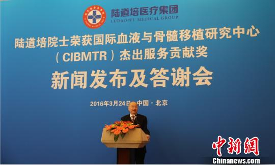 中新网北京3月24日电 (记者 宋敏涛)中国工程院院士陆道培荣获了国际血液和骨髓移植研究中心(CIBMTR)2016年杰出服务贡献奖。陆道培是获此奖项的第一位中国人,颁奖仪式已于日前在美国夏威夷举办。24日上午,陆道培所在医疗机构和其学生们在北京钓鱼台国宾馆为其举行了新闻发布会。