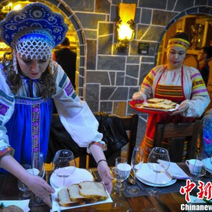 来自格鲁吉亚的服务员身着传统服饰忙碌着,为食客们奉上正宗东欧美食。 刘新 摄