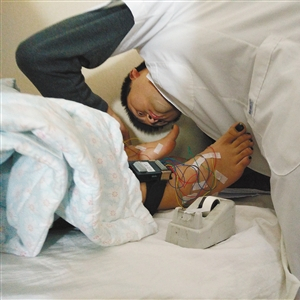 求医者接受“经络检测”时脚上插满电线。 李强 摄