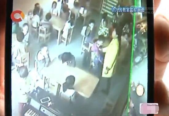 主持人:情况果真跟孩子们说的一样吗?随后,家长们来到了重庆市政府机关幼儿园幸福里分园,调取了教室里面监控录像。我们可以看一下,录像的截 屏是什么样的?当时,这个穿黄衣服的老师,据当时人说是在扇孩子,这边(截屏),把孩子从座位的端头推到另外一侧,拎着衣领。我们看一下,教室里的监控录 像,记录的真相是什么样的。