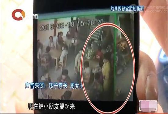 家长 周女士:现在把小朋友提起来,这个小朋友坐的好好的,没有犯什么错,就把这个小朋友提起来。推别人,推的第一下,再推第二下,差点推到地上去了。