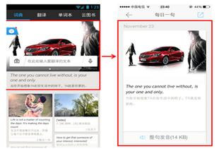 这个看起来十分高大上的英文例句,其实是一个广告。这种广告模式,来自国内最早进行原生广告实践的APP——有道词典。将产品图片与品牌内涵,以英文例句的形式展现,瞬间提升了产品格调,置于APP页面中也不显得突兀。