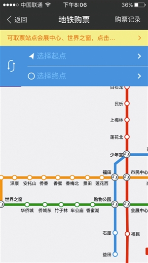 用户选择进入深圳地铁购票功能,选择起点终点站。用户选择完地铁站起点、终点后,选择立即付款,在支付宝收银台进行购票付款。完成地铁购票后,在选站购票页面选择购票记录可进行查看(地铁票兑换券当天有效)。