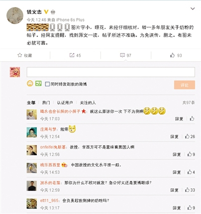 3月31日下午,微博博主钱文忠删除上述微博,并称帖子所述不准确。