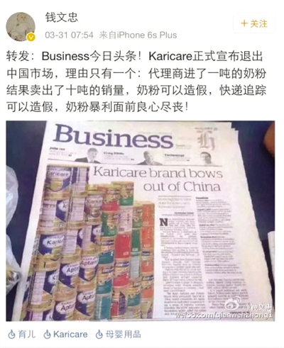 微博博主钱文忠称:“Karicare正式宣布退出中国市场,理由只有一个:代理商进了一吨的奶粉结果卖出了十吨的销售,奶粉可以造假,快递追踪可以造假……”博文下还附上新西兰报纸《Business》一篇头版报道《可瑞康品牌退出中国》的截屏。