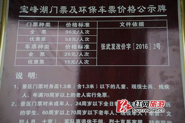 宝峰湖游客中心售票窗口的价格公示栏显示,身高1.3米(含1.3米)以下的儿童乘坐环保车实行免票,未成年人、24周岁以下全日制大学本科及以下学历的学生、残疾人、60周岁以上老年人、现役军人、军队离退休干部、烈士直系家属、持有民政部门颁发的《城乡居民最低生活保障金领取证》的人员,均凭有效证件享受环保车优惠票,优惠票价为15元/人次(含往返),与原优惠票价相比下调3元/人次。另外,景区在出售环保车票时需坚持游客自愿乘坐的原则,不得与景区门票捆绑销售。