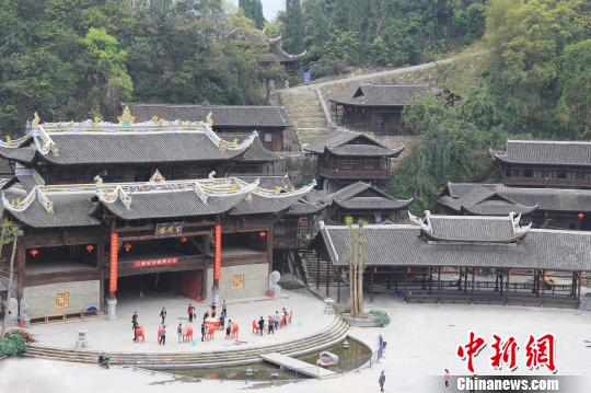 中新网重庆4月1日电 (蒋青琳)千百年来,清明时节祭祀黄、炎二帝已成为传统,作为“华夏三祖”之一的蚩尤祭礼,却鲜有耳闻。1日,记者来到重庆彭水县境内的苗族传统建筑群——蚩尤九黎城,感受地道苗族风情,揭开其神秘的面纱。