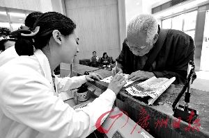 一名高龄老人拿着一份《广州日报》到现场报名免费种牙。