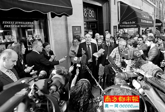 劫案发生后,一名警官在哈顿花园88-90号前对媒体说明情况。
