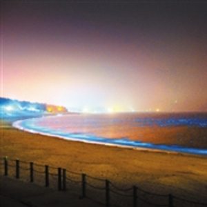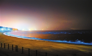 记者昨晚获悉,昨日下午大鹏办事处鹏城社区较场尾海面也出现了大片暗红色藻类聚集,到晚间也呈现出荧光海浪的景象。