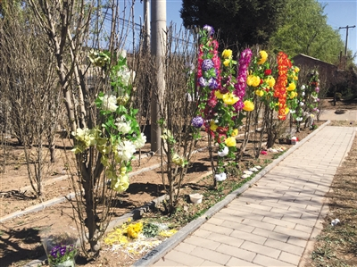 3月29日下午,丰台区思亲园公墓大门左手边,沿着围墙走向的一条新建的弧形花坛,长约100米,花坛中每隔数米有一根两米多高的柱子,共12根。其中一根柱子已经刻上一个名字。