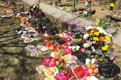 昨日,北京长青园,骨灰深埋区,摆满祭品。