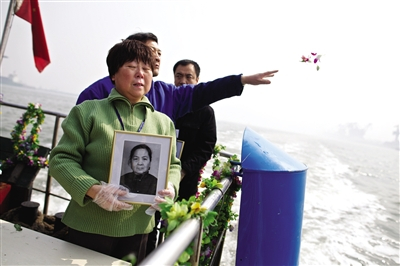 市民手捧已故亲人照片,在甲板上将亲人骨灰撒向大海。