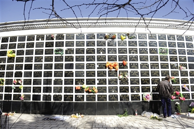 市民在长青园壁葬墙前祭奠逝去的亲人。