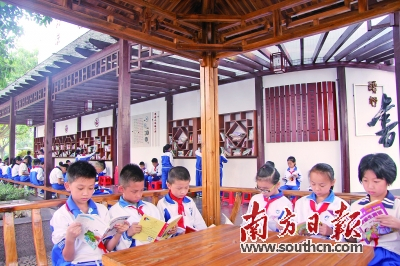 ←新兴县实验小学在校园设置读书长廊供学生读书。冯凯思 摄