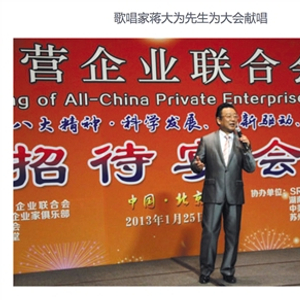 被曝光的“中华民营企业联合会”于2013年1月25日举行了一次年会,该组织在网络上发布的活动报道中,刊登了一张“歌唱家蒋大为先生为大会献唱”的照片。