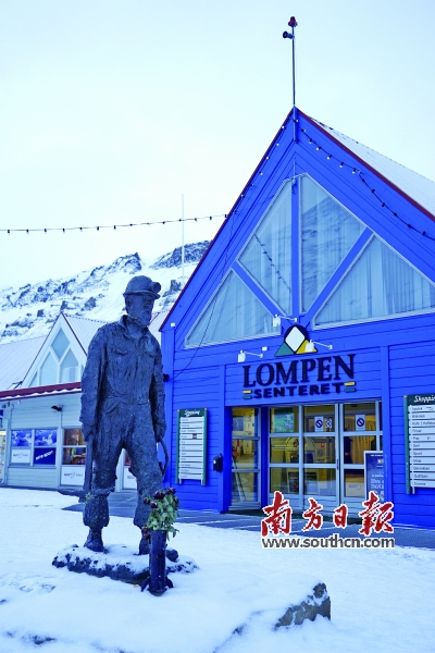 然后我们在大雪纷飞的夜色中去朗伊尔城区随意晃荡。说是城区,其实就是一条街,左右有一些商店、邮局、超市、酒吧和旅馆,顺着主路漫行,便能在那间唯一的超市外面看到一个矿工的雕像,在雪夜昏黄的路灯下,他是那样的坚毅寂寥。雕像是黑色的,朗伊尔城的建筑都是彩色的尖顶屋,四处都是皑皑白雪,还有“北极熊”。据说斯瓦尔巴德群岛上拥有超过5000头北极熊,数量超过了居民,地图上也有显著的标识,注明了哪些地方不可以独自前往,因为,如果遇到北极熊,赤手空拳的你将无路可逃。而另一个有趣的说法则是朗伊尔城无处不见北极熊,从机场到城区,几乎所有的商场酒吧旅馆最显眼的标识,都是北极熊。后来我们还在路边看到了一个不锈钢制作的北极熊城市雕塑,在大雪中泛着清冷透寒的光,我们说,这其实也是一座北极熊之城呢。
