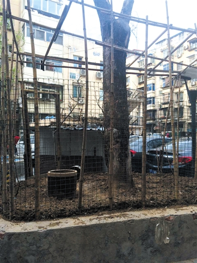 昨天,新京报记者实地探访发现,该小区为芳园南里西区,在1号楼楼下,记者看到一个大花坛,被人用铁丝网围住,和图片上所显示的一致。