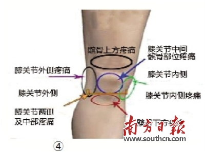 参看图④,髌骨上方疼痛可能是髌上滑囊或股四头肌肌腱的损伤,比较常见的原因就是股四头肌长期负荷过大,没有及时放松,造成肌肉僵硬、柔韧性下降,导致肌腱部位的负荷过大。在膝盖正面部位的疼痛有几个可能的原因:一是髌骨软化症,即髌骨软骨面过度磨损,软骨细胞脱落,骨质增生,关节间隙狭窄等一系列病理变化;二是髌骨滑动轨迹出现异常,造成髌骨的内侧软骨面磨损加剧引起疼痛;三是髌上滑囊炎也可会引起这个部位疼痛。髌骨下方疼痛的原因可能是:一、髌韧带过度紧张;二、髌骨—股骨关节稳定性降低所致。膝关节内侧疼痛的原因可能是:一、内侧半月板损伤;二、内侧副韧带损伤;三、鹅掌(缝匠肌、股薄肌和半腱肌肌腱的重叠接合部)滑囊慢性损伤;四、膝关节炎。膝关节外侧疼痛的可能原因是:一、外侧副韧带损伤;二、髂胫束过于紧张。如果膝关节内、外侧及膝盖里面都有疼痛,则可能是半月板损伤或者十字韧带的损伤。