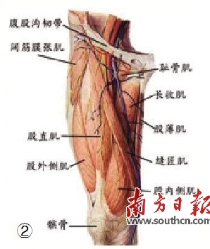 肌肉是关节和骨骼运动的动力来源, 膝关节周围主要的肌肉有大腿前面的股四头肌(有4个分支分别为股直肌、股中肌、股内侧肌和股外侧肌),大腿后群的腘绳肌,以及小腿后群的腓肠肌等(见图②和图③)。
