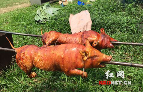 时下,游客还可在岸边品尝烤乳猪、烤鸭、糍粑等美食。