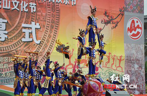 在崇左市行政中心广场,8个民族舞蹈节目,拉开了崇左花山文化节的序幕。舞蹈《花山壮拳》取材于花山岩画古老的骆越艺术,演绎了一名大学生在游览花山风光时偶遇习壮拳者,学习壮拳弘扬少数民族传统体育的故事。来自广西体专的表演者们舞姿粗犷彪悍又不失细腻,动作沉实稳重又灵快,完全把神秘花山岩画演活了,赢得台下掌声阵阵。