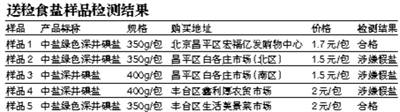 随机在北京3家农贸市场、1家大型超市购买5袋“食用碘盐”。