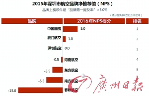 广州日报讯 (文/表 记者)深圳市民最愿意向亲朋好友推荐哪家航空公司?昨日,深圳市消委会发布航空公司NPS(中文“净推荐值”)调查,公布了深圳市场内的七家航空公司NPS结果,其中国航得分最高,春秋航空垫底。这也是市消委会向社会公布的首个NPS调查项目。