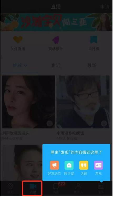最近,在陌陌最新6.7版本的更新中,上线了一段时间的陌陌直播,重要性被提升到了战略级别,替代了原先底栏的“发现”按钮(见下图红框处)。