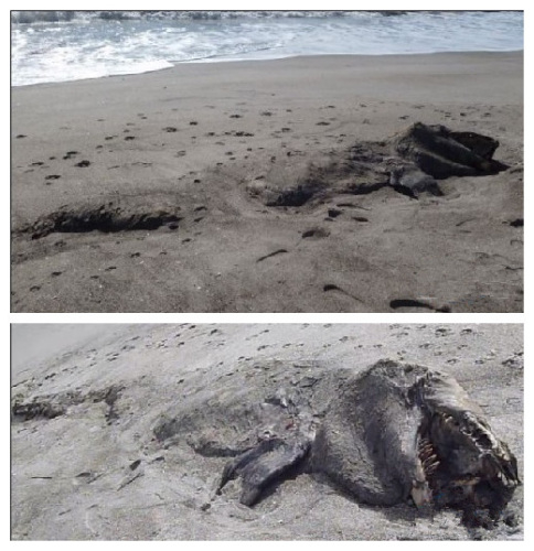 据报道,怪兽是27岁的彼得•贝利在海滩边遛狗时发现的。他接受采访时说,“我当时以为是一匹马,但它有熊一般的爪子和猪的身体。但没有怪气味。”