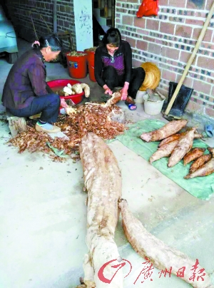 韶关市的一名农妇,近日在开挖山坡时,挖出一条约200斤重的巨型半野生粉葛。