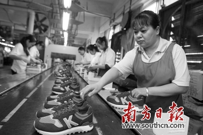 300多家鞋企将亮相加博会。图为永都鞋业生产车间,工人在流水线上作业。南方日报记者 孙俊杰 摄